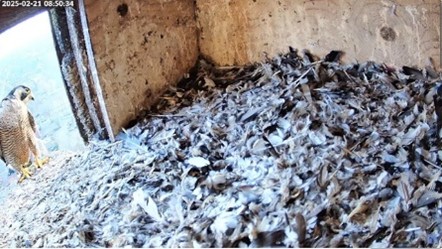 Es bestand schon länger der Wunsch, eine Kamera im Nistkasten anzubringen, um das Balz- und Brutverhalten sowie auch die Fütterung der Nestlinge beobachten und der interessierten Öffentlichkeit zu präsentieren. Die BINGO-Umweltstiftung sicherte uns die nötigen Gelder für die Aktion nach Beschreibung des Projektes und entsprechenden Kostenvoranschlägen zu. Nachdem am 17.02.25 die Installation der Kamera und der notwendigen Kabel abgeschlossen war, konnte am gleichen Tag gegen 17.45 Uhr der erste Erfolg in einem Video dokumentiert werden. Die Kamera kann im Nachtsichtmodus mit Infrarot arbeiten, was die Tiere nicht stört. In Kürze ist es möglich, die Falken live im Internet zu betrachten.
