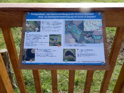 Nun wurde auf Initiative der BUND Kreisgruppe durch die Errichtung einer Aussichtsplattform im Bereich der Vechtebrücke an der Schulstraße in Quendorf eine Möglichkeit geschaffen, interessierte Menschen über die Fließgewässer- und Auenentwicklung an der Vechte in Quendorf zu informieren. Die Plattform ist so gestaltet, dass sie barrierefrei zu nutzen ist. Zudem erläutern auf der Plattform angebrachte Informationsschilder die ökologische Bedeutung der Maßnahmen, beschreiben die neu geschaffenen Strukturen des Flusses und der angrenzenden Aue und weisen auf charakteristische Tier- und Pflanzenarten dieser Lebensräume hin.