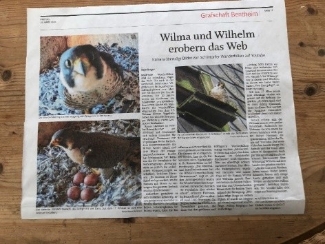 Seit vielen Jahren brüten Wanderfalken im Nistkasten an der Ostseite des Kirchturmes der ev.-ref. Kirche in Schüttorf in etwa 50 Metern Höhe. Da sich der Brutkasten im Dach weit vom Publikumsverkehr befindet, können die Falken dort in Ruhe brüten.